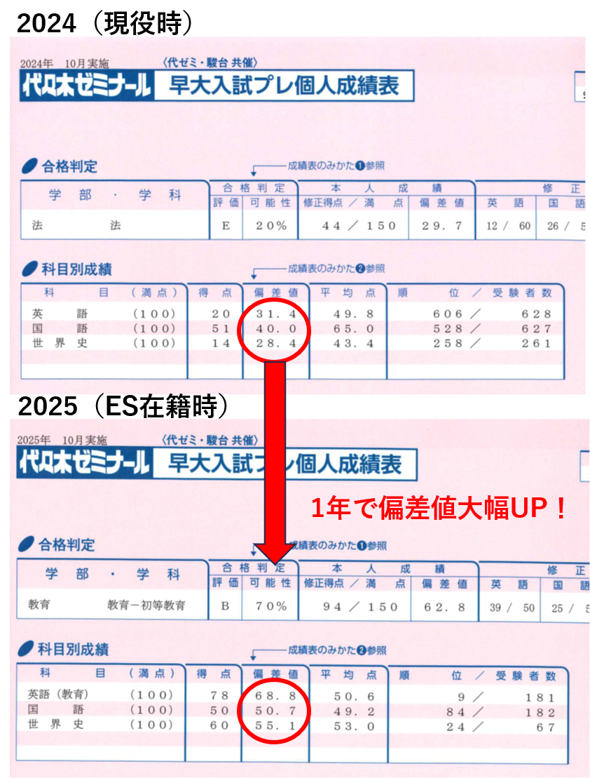 ※ 入塾前後で模試の偏差値が大幅にアップ。英語・世界史を中心に着実に実力を積み上げた10か月の努力が数字に表れています。